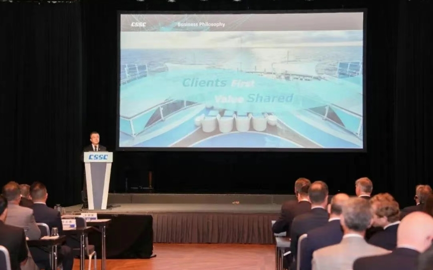 王国强向全球主要船东和合作伙伴宣讲了“中船集团 智领深蓝”的企业品牌理念,阐述了中船集团未来十年的“高端化、绿色化、智能化、共享化”战略规划方向,以及与全球广大船东用户“开放合作、共创共赢”的经营理念。他强调,作为全球jxf吉祥坊市场绿色低碳发展的引领者、践行者和先行者,中船集团始终坚持创新驱动的发展理念,以构建海洋命运共同体为使命,持续加快核心技术协同攻关,不断深化与全球航运企业及国际海事界的多赢合作。