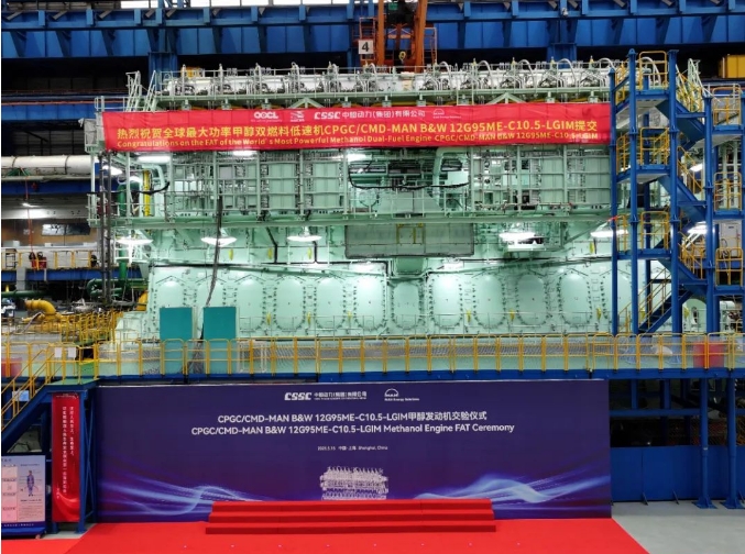 5月15日,中船集团旗下中船动力与MAN ES联合举办的CPGC/CMD-MAN B&W 12G95ME-C10.5-LGIM-EGRTC甲醇发动机工厂验收测试(FAT)交验仪式在中船动力下属中船三井成功举行。